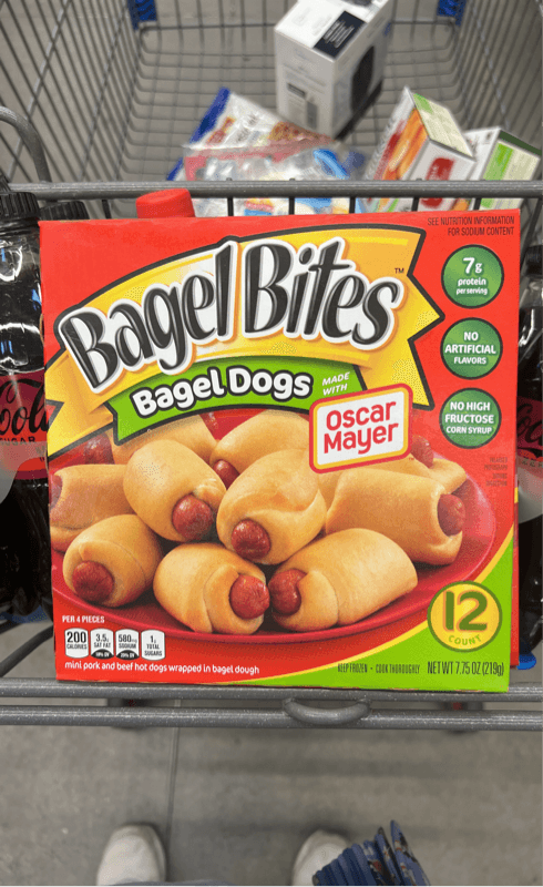 Bagel dough (enriched wheat flour [wheat flour, niacin, reduced iron, thiamine mononitrate, riboflavin, folic acid], malted barley flour, water, yeast [yeast, sorbitan monostearate, ascorbic acid], salt, sugar, soybean oil, dextrose, ascorbic acid), cocktail franks made with pork and beef (pork, water, beef, salt, less than 2% of flavorings [contains mustard], potassium lactate, sodium diacetate, paprika, sodium erythorbate, sodium nitrate).