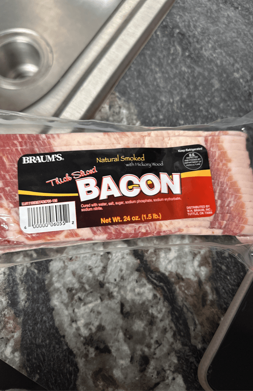 Bacon, cured with water, salt, sugar, sodium phosphate, sodium erythorbate, sodium nitrite.