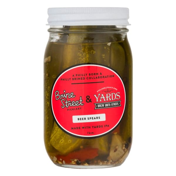 Cucumbers, garlic, rosemary, chile de arbol, yards ipa, vinegar, water, salt, mustard seed, spices.