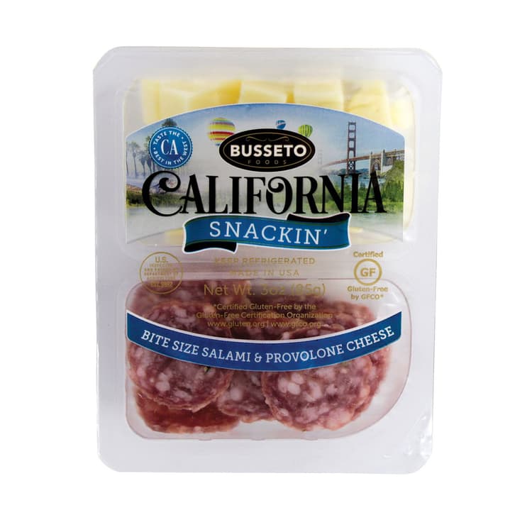 Bite size salami ingredients: pork, salt, and less than 2% of the following: dextrose, wine, natural flavorings, sodium erythorbate, sodium nitrite, lactic acid starter culture. provolone ingredients: pasteurized milk, cheese cultures, salt and enzymes.