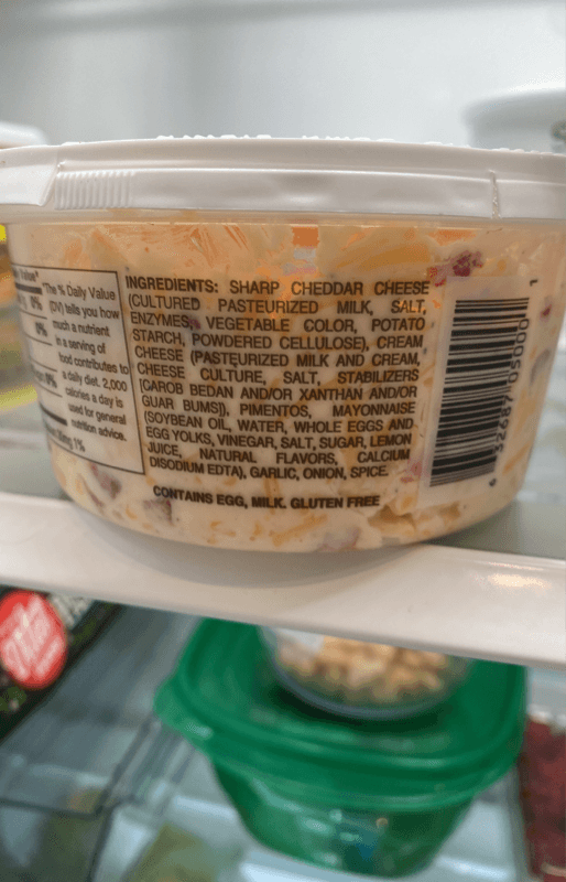 Sharp cheddar cheese (cultured pasteurized milk, salt, enzymes, vegetable color, potato starch, powdered cellulose), cream cheese (pasteurized milk and cream, cheese culture, salt, stabilizers [carob bean and/or xanthan and/or guar gums]), pimentos, mayonnaise (soybean oil, water, whole eggs and egg yolks, vinegar, salt, sugar, lemon juice, natural flavors, calcium disodium edta), garlic, onion, spice.