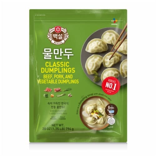 Filling: beef, pork, leek, cabbage, onion, green onion, garlic, textured soy flour, sugar, salt, soy sauce (water, soybeans, wheat, salt), sesame oil, ginger, monosodium glutamate, yeast extract, black pepper. Wrapper: wheat flour, water, corn starch, wheat gluten, sweet rice flour, salt, maltodextrin, soybean oil, xanthan gum.
