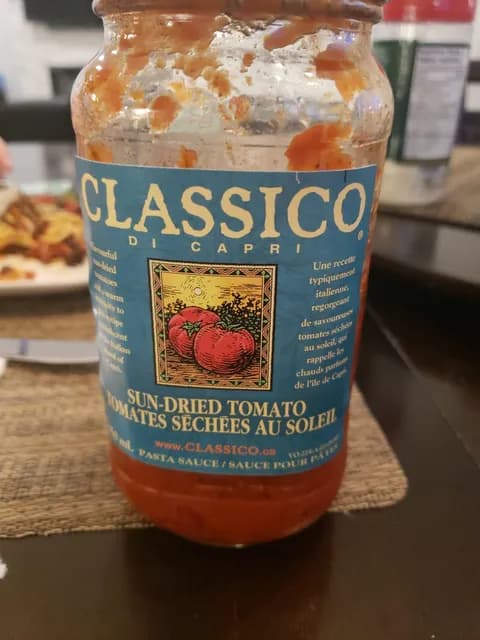 Tomato puree, water, tomatoes, tomato juice, soybean oil, sun-dried tomatoes (sulphites), salt, olive oil, dehydrated garlic, garlic puree, basil, black pepper, citric acid, calcium chloride, red pepper.