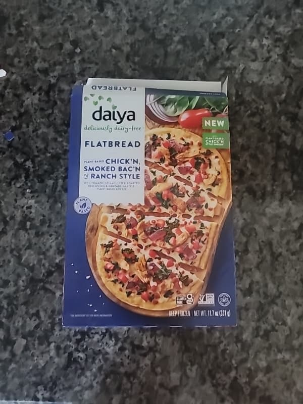Gluten-free crust (water, tapioca flour, rice flour, potato starch, chickpea flour, milled flaxseed, rice starch, olive oil, cane sugar, yeast, sea salt, psyllium, chicory root fiber, xanthan gum, locust bean gum), cutting board collection mozzarella style shreds (filtered water, tapioca flour, coconut oil, expeller pressed safflower oil, natural flavors, chickpea protein, salt, tricalcium phosphate, lactic acid, konjac flour, xanthan gum, yeast extract, fruit and/or vegetable juice color), ranch dressing (expeller pressed canola oil, water, white vinegar, cane sugar, sea salt, chickpea protein, natural flavors, cultured dextrose, lactic acid, xanthan gum, spices, yeast extract, herbs), plant-based chick'n style shreds (water, tmrw™ protein (pea protein isolate, oat flour, rice protein), expeller pressed canola oil, natural flavors, apple cider vinegar, sea salt), tomato, onions, smoked plant-based bac'n style bits (pea protein, sorghum flakes, tapioca syrup, natural flavors, coconut oil, salt, paprika oleoresin color, caramel color), spinach.