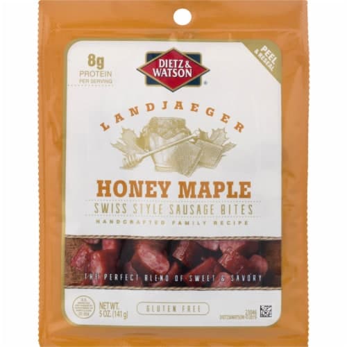 Pork, beef, honey, salt, contains less than 2% of maple syrup, sugar, dextrose, spice, natural flavoring, maple granules (cane refinery syrup, maple syrup, natural flavors), sodium erythorbate, garlic powder, spice extractives, lactic acid starter culture, sodium nitrite.