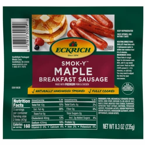 Meat ingredients (pork, beef), mechanically separated turkey, water, corn syrup, contains 2% or less of dextrose, flavorings, maple syrup, autolyzed yeast, mechanically separated chicken, modified food starch, monosodium glutamate, potassium and sodium lactate, salt, sodium diacetate, sodium nitrite, sodium phosphate, vitamin c (ascorbic acid).