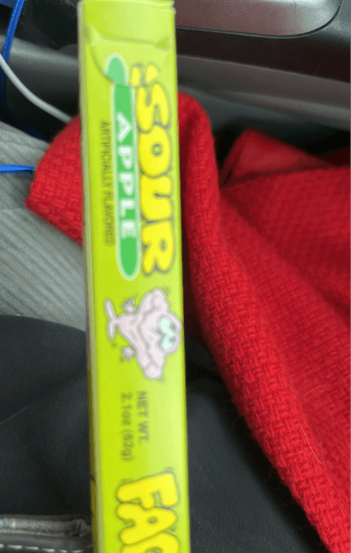 Sugar, corn syrup, gum base, malic acid, citric acid, glycerine, *soy lecithin, artificial flavor, bht (to maintain freshness), yellow 5, blue 1.