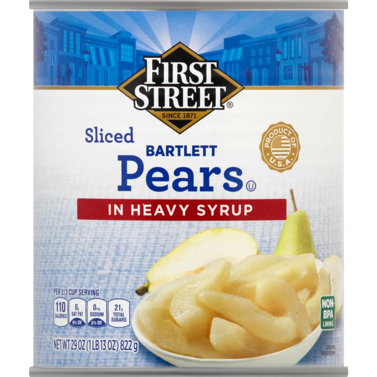 Ingredient List: First Street Pears, In Heavy Syrup, Bartlett, Sliced