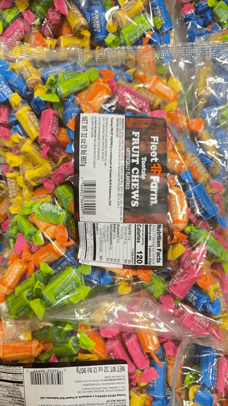 Sugar, corn syrup, palm oil, condensed skim milk, whey, malic acid, artificial and natural flavors, soy lecithin, artificial colors (including yellow 5, red 40, blue 1).