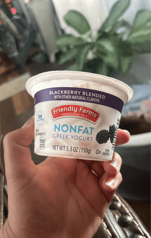 Cultured pasteurized grade a nonfat milk, blackberry puree, sugar, corn starch, natural flavors, fructose, fruit and vegetable juice concentrate (for color), sucralose, acesulfame potassium, calcium citrate. contains the following live and active cultures: l. Bulgaricus, s. Thermophilus, l. Acidophilus, bifidus, l. Casei.