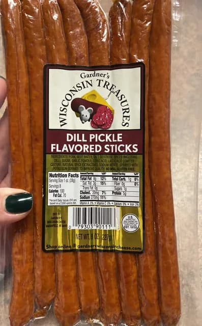Pork, beef, water, salt, dextrose, spices (including dill), sugar, garlic powder, citric acid, lactic acid starter culture, natural spice extractives, sodium nitrite. Sprayed with potassium sorbate to improve quality.