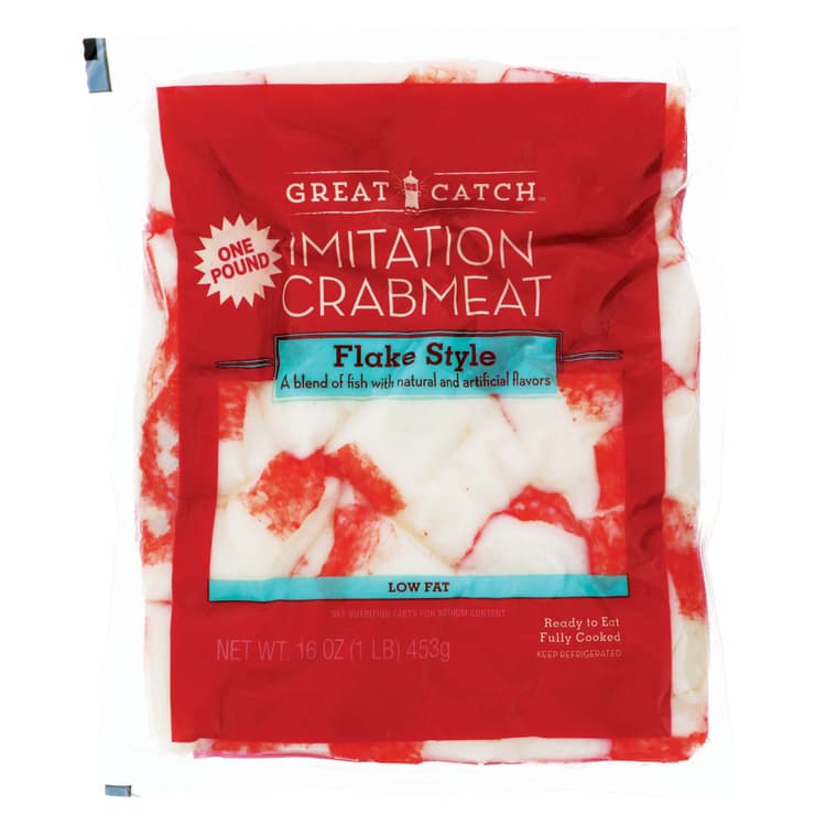 Fish protein (alaska pollock and/or pacific whiting), water, wheat starch, egg whites, sorbitol, sugar, potato starch, contains 2% or less of: modified potato starch, soybean oil, salt, potassium chloride, natural and artificial crab flavor (swimming crab, maltodextrin, disodium guanylate, disodium inosinate), mirin wine (sake, sugar, salt, water, yeast extract), sodium tripolyphosphate, tetrasodium pyrophosphate, carmine, paprika oleoresin, color added.