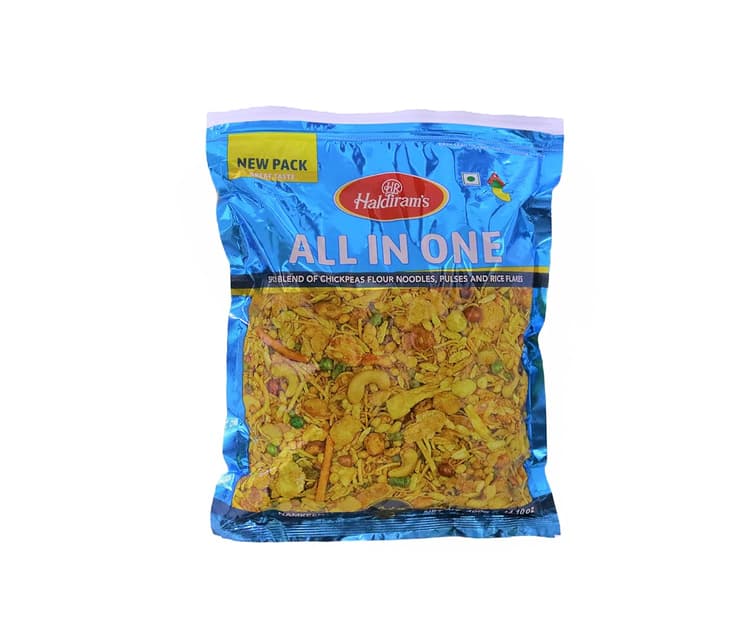 Chickpeas flour (19%), vegetable oil (cotton seed, corn & palmolein), tepary beans flour (6%), chickpeas pulse (5%), split mung bean (5%), lentil (3%), potatoes (3%), cornflakes (derived from corn) (3%), rice flakes, rice powder, starch (sago), raisins, cashews, peanuts, green peas, sugar powder, spinach powder, salt, red chili powder, turmeric powder, mango powder, black pepper powder, ginger powder, clove powder, mace powder, nutmeg powder, onion powder, garlic powder, cardamom powder, fennel, coriander powder, mini leaves powder, cumin powder, asafoetida powder, acidity regulator [citric acid powder (e 330), malic acid (e 296), sodium bicarbonate (e 500(ii)] and anticaking agent [silicon dioxide (e551)].