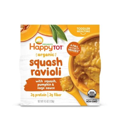 Organic sauce [butternut squash puree (organic ingredients), water, pumpkin puree (organic ingredients), apple puree (organic ingredients), salt, ground sage (organic ingredients), onion powder (organic ingredients)], organic raviolis [whole wheat durum flour (organic ingredients), water, butternut squash (organic ingredients), bread crumbs (organic ingredients) (wheat flour (organic ingredients), water, yeast, salt), corn starch (organic ingredients), vital wheat gluten (organic ingredients), dijon mustard (organic ingredients) (distilled vinegar (organic ingredients), water, mustard seeds (organic ingredients), salt, spices (organic ingredients), salt, spices (organic ingredients)].