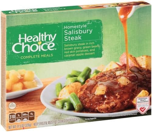Salisbury steak and textured vegetable protein patty (beef, water, pork, textured soy protein concentrate [soy protein concentrate, isolated soy product, caramel color], contains 2% or less of: rolled oats, flavorings, rochester sauce [distilled vinegar, corn syrup, water, salt, garlic powder, spices, tamarind, natural flavor], modified corn starch, beef flavor [contains beef extract, yeast extract, salt, flavor, maltodextrin, lactic acid, citric acid], salt, potassium chloride, soy lecithin), gravy (water, modified corn starch, onions, beef flavor [cooked beef, yeast extract, beef tallow, beef extract, flavoring, salt, sugar, vegetable juice concentrates {onion, carrot, celery}, lactic acid], contains 2% or less of: butter [cream, salt], burgundy wine, potassium chloride, canola oil, garlic, sea salt, rochester sauce [distilled vinegar, corn syrup, water, salt, garlic powder, spices, tamarind, natural flavor], black pepper), green beans, russet potatoes, apples (citric acid and ascorbic acid to retain color), water, brown sugar, modified food starch, cream, acetylated monoglycerides, salt, alcohol, natural flavors. Contains: milk, soy.