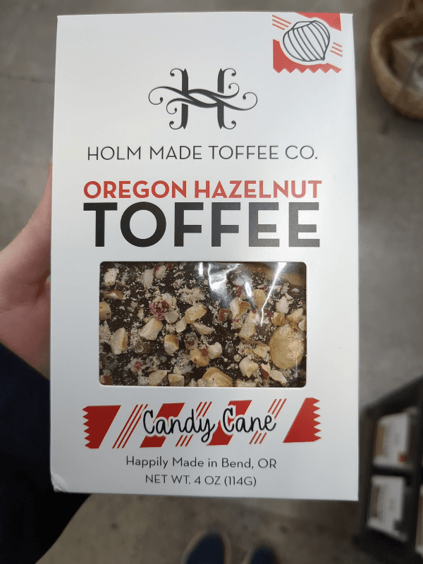Butter [cream (milk) & salt], pure cane sugar, oregon hazelnuts, dark chocolate [unsweetened chocolate, sugar, sunflower lecithin and vanilla], peppermint extract, crushed candy cane bits [pure cane sugar, organic rice syrup, pure peppermint oil, colored with red cabbage and purple carrots]