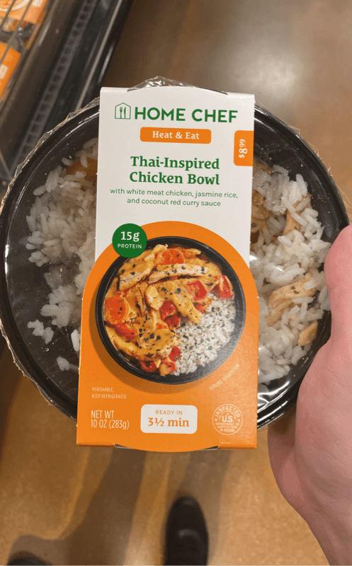 Cooked rice (water, long grain jasmine rice), red curry sauce (coconut milk [coconut extract, water], water, whole milk [milk, vitamin d3], sugar, corn starch, panang curry paste [dried red chili, lemon grass, shallots, salt, garlic, galangal, mungbean, shrimp paste {shrimp, salt}, kaffir lime peel, coriander seed, cumin], soy sauce [water, soybeans, wheat, salt], natural flavors, fish sauce [anchovy extract, salt, sugar], lime juice), seasoned chicken breast with rib meat (grilled seasoned chicken strips [chicken breast meat with rib meat, water, salt, lemon juice concentrate, vinegar, rice starch, black pepper], canola oil, natural flavors, paprika [paprika, silicon dioxide, ethoxyquin], spice), vegetable mix (carrots, red bell pepper, natural flavors).