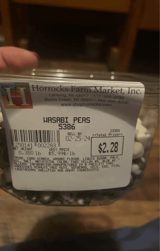 Peas, corn starch, wasabi flavor, liquid sugar, palm oil, salt, artificial color: fd&c yellow #5, blue #1.