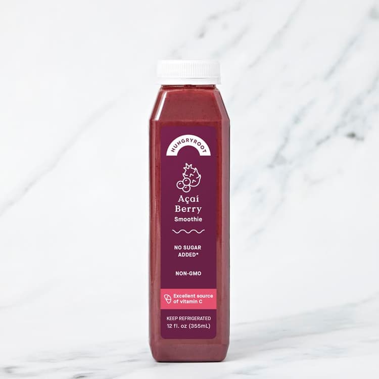 Organic fair trade acai (filtered water, organic acai), blueberries, strawberries, banana, chia seeds, pink dragonfruit