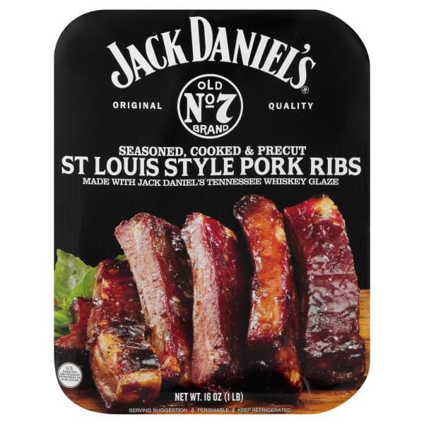 St. Louis style pork loin ribs, water, contains 2% or less of salt, black pepper, brown sugar, granulated garlic, granulated onion; whiskey glaze: sugar, water, molasses, apple cider vinegar, onion, soy sauce (water, wheat, soybeans, salt), modified food starch, contains 2% or less of soybean oil, garlic, jack daniel's tennessee whiskey, salt, lemon juice, caramel color, black pepper, cayenne pepper.