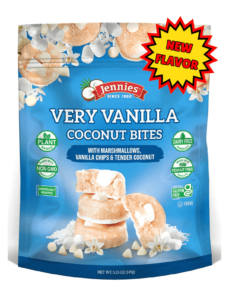 Organic sulfite free coconut, organic tapioca syrup, vanilla chips (sugar, palm kernel and palm oil, natural flavor, sunflower lecithin, an emulsifier, and salt) marshmallows (tapioca syrup, cane sugar, filtered water, tapioca starch, carrageenan, soy protein, natural vanilla), invert sugar, organic sunflower lecithin, himalayan pink sea salt and natural vanilla.