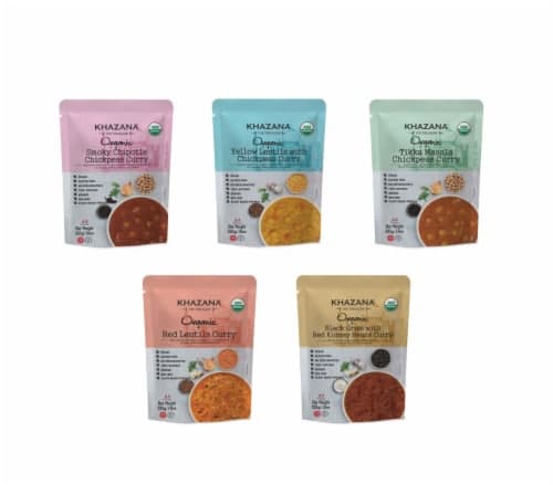 1) organic red lentils curry: ingredients: organic red lentils, water, organic tomatoes, organic onions, organic sunflower oil, organic garlic, organic ginger, salt, organic coriander leaves, organic spices (turmeric, cumin, curry leaves, asafoetida). 2) organic yellow lentils with chickpeas curry: ingredients: water, organic yellow lentils, organic chickpeas, organic red lentils, organic tomatoes, organic onions, organic sunflower oil, organic ginger, organic garlic, salt, organic spices (cumin, coriander, turmeric, curry leaves, asafoetida). 3) organic black gram with red kidney beans curry: ingredients: organic tomatoes, organic black gram, water, organic red kidney beans, organic split bengal gram, organic coconut milk, organic sunflower oil, organic ginger, salt, organic garlic, organic green chili, organic spices (red chili, cumin, cinnamon, green cardamom, clove, bay leaves, star aniseed, turmeric, coriander). 4) organic smoky chipotle chickpeas curry: ingredients: organic tomatoes, organic chickpeas, water, organic onions, organic potatoes, organic green capsicum, organic brown sugar, organic garlic, salt, organic spices (black pepper, paprika, chili powder, oregano, bay leaves powder). 5) organic tikka masala chickpeas curry: ingredients: organic tomatoes, water, organic chickpeas, organic onions, organic cashew nuts, organic coconut milk, organic sugar, organic sunflower oil, salt, organic ginger, organic garlic, organic dry fenugreek leaves, organic spices (cumin, coriander, cinnamon, green cardamom, cloves, bay leaves, red chili, black pepper).