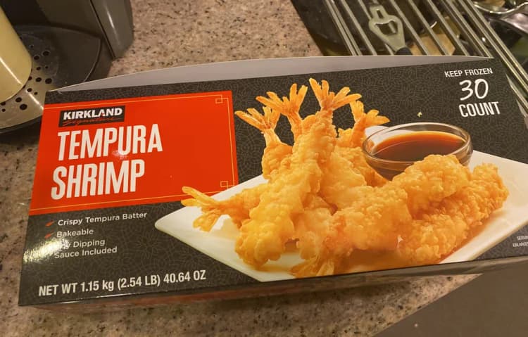 Tempura shrimp: farm raised shrimp (shrimp, water and salt), tempura batter (water, wheat flour, corn starch, rice flour, yellow corn flour, raising agents [sodium acid pyrophosphate, sodium bicarbonate], salt, dextrose), soybean oil, modified food starch (tapioca, safflower oil), rice flour, salt. Dipping sauce: water, sugar, soy sauce (molasses, water, salt, soybean, wheat flour), maltodextrin, modified tapioca starch, salt, yeast extract.