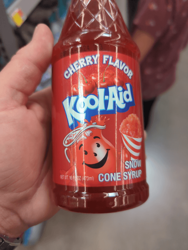 Water, high fructose corn syrup, artificial cherry flavor, citric acid, propylene glycol, xanthan gum, sodium benzoate (preservative), acesulfame potassium, fd&c red #40, fd&c blue #1