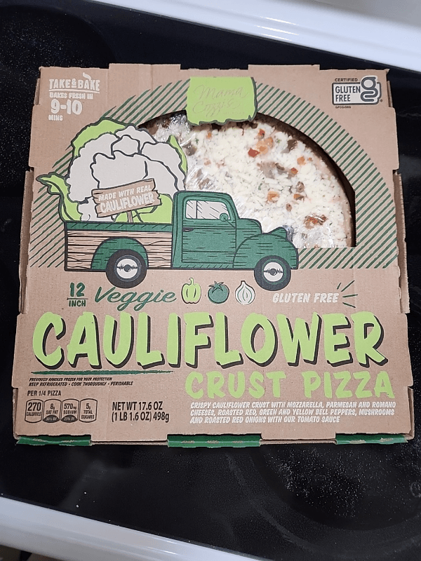 Crust (cauliflower, low moisture mozzarella cheese [pasteurized milk, cheese cultures, salt, enzymes], rice flour, egg whites, rice starch, flax meal, contains less than 2% of the following: cane sugar, yeast, salt, cultured brown rice, garlic powder, spices, brown rice flour, citric acid, lactic acid), low moisture mozzarella cheese (pasteurized milk, cheese culture, salt, enzymes), pizza sauce (tomatoes [tomatoes, tomato juice, citric acid], water, tomato paste, sugar, modified cornstarch, salt, parmesan & romano cheese made from cow's milk [pasteurized part skim milk, cheese culture, salt, enzymes], citric acid, spices, potassium sorbate and sodium benzoate as preservatives, onion powder, garlic powder), fire roasted vegetables (tomatoes, red bell pepper, green bell pepper, yellow bell pepper, red onions), fire roasted brown mushrooms, grated parmesan and romano cheeses (pasteurized cow's milk, cheese cultures, salt, enzymes, powdered cellulose added to prevent caking), spices, dehydrated garlic.