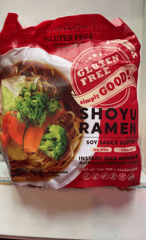 Noodle: white rice flour (non gmo), potato starch, modified starch, alginic acid ester, vitamin b2 (color) soup base: water, sweet rice wine, salt, hydrolyzed vegetable protein, gluten free soy sauce, sugar, flavoring oil, vegetable oil, yeast extract, onion, garlic, ginger, brewed vinegar, caramel color