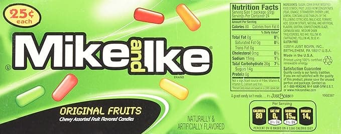 Sugar, corn syrup, modified food starch, contains less than 0.5% of the following: citric acid, malic acid, fumaric acid, sodium citrate, natural and artificial flavors, dextrin, confectioners glaze, carnauba wax, medium chain triglycerides, red 40, yellow 6, yellow 5 (tartrazine), blue 1.