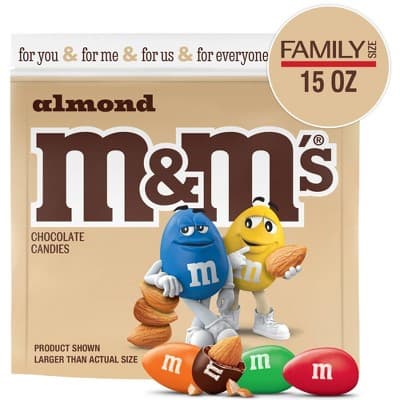 Milk chocolate (sugar, chocolate, skim milk, cocoa butter, lactose, milkfat, almonds, soy lecithin, salt, artificial and natural flavors), almonds, sugar, cornstarch, less than 1% - corn syrup, dextrin, coloring (includes blue 1 lake, yellow 6, red 40, yellow 5, blue 1, yellow 6 lake, red 40 lake, yellow 5 lake, blue 2 lake, blue 2), carnauba wax, gum acacia.