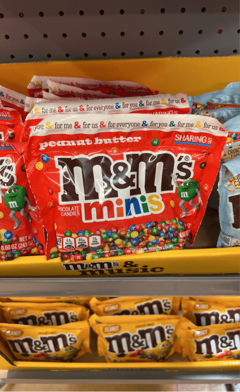 Milk chocolate (sugar, cocoa butter, chocolate, milk, lactose, peanuts, milkfat, soy lecithin, salt, natural flavor), sugar, peanut butter (partially defatted peanuts, palm oil), vegetable oil (palm and sunflower oils) and/or hydrogenated palm kernel oil; less than 2% of: cornstarch, dextrose, natural flavor, corn syrup, dextrin, salt, colors (includes blue 1 lake, yellow 6, red 40, yellow 5, blue 1, yellow 6 lake, red 40 lake, yellow 5 lake, blue 2 lake, blue 2), carnauba wax, propyl gallate to maintain freshness, gum acacia.