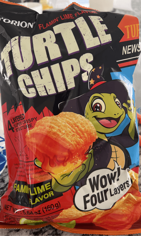 Turtle chips pellet (corn snack mix, maize flour, vegetable oil, sodium bicarbonate, salt), vegetable oil, hot chili pepper and lime seasoning (salt, sugar, vegetable oil powder, monosodium l-glutamate, glucose, vinegar powder, onion powder, maltodextrin, lemon & lime juice powder, red chili powder, citric acid, sodium acetate, tomato powder, calcium phosphate, sodium caseinate, silicon dioxide, whey powder, disodium 5'-ribonucleotide, hydrolyzed soy sauce powder, oleoresin paprika, garlic powder, yeast, lime flavor, spicy powder, chili flavor, dl-malic acid, shallot flavor, rapeseed oil, oleoresin capsicum, black pepper powder, aspartame)