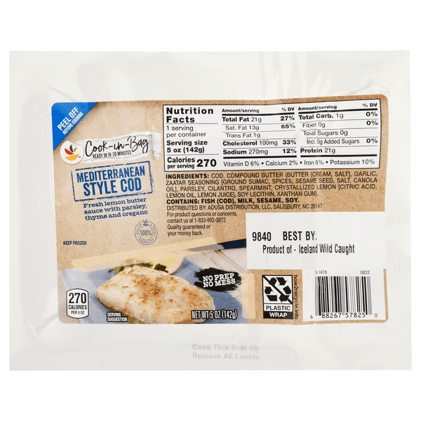 Cod, compound butter (butter [cream, salt], garlic, zaatar seasoning [ground sumac, spices, sesame seed, salt, canola oil], parsley, cilantro, spearmint, crystallized lemon [citric acid, lemon oil, lemon juice], soy lecithin, xanthan gum).