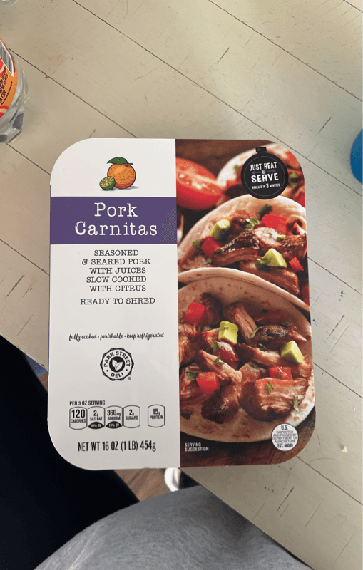 Pork, water, contains less than 2% of cane sugar, sea salt, soybean oil, dextrose, orange juice solids, maltodextrin, lime juice, lime oil, sodium carbonate, browned in oil.