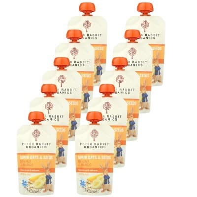 Organic banana puree, organic mango puree, organic peach free, organic oats, organic chia organic quinoa lemon juice concentrate.