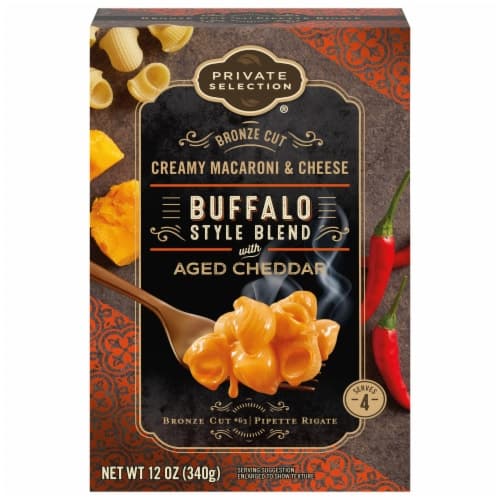 Bronze cut enriched macaroni product (durum wheat semolina, niacin, ferrous lactate [iron], thiamine mononitrate, riboflavin, folic acid), buffalo cheese sauce (water, aged white cheddar cheese [pasteurized milk, cheese culture, salt, enzymes], canola oil, whey, non-fat dry milk, sodium phosphate, maltodextrin, white distilled vinegar, whey protein concentrate, cayenne pepper sauce powder [hot sauce {aged red cayenne peppers, vinegar, salt, garlic}, maltodextrin], contains 2% or less of: color added [beta carotene, paprika extract], natural flavors, salt, mono and diglycerides, spice (dehydrated), sodium alginate, onion powder, garlic powder, xanthan gum, sorbic acid [to preserve freshness], lactic acid).
