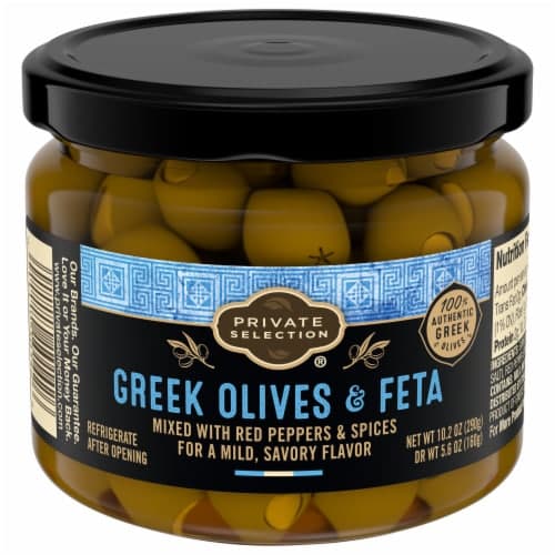 Sunflower oil, pitted olives, feta cheese (sheep and goat milk, rennet, salt), red pepper strips, garlic, spices, sea salt, citric acid (acidity regulator).