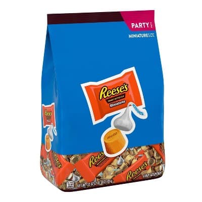 Careful: small candy can be a use caution when eating., hershey's milk chocolate kisses - contains: milk, soy.,reese's peanut butter cups miniatures - contains: peanuts, milk, soy.,rolo candy - contains: milk, soy.