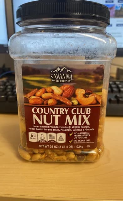 Peanuts, honey sesame sticks (flour [wheat flour, malted barley flour], vegetable oil [peanut, cottonseed, soybean and/or sunflower seed], sugar, sesame seeds, bulgur wheat, contains less than 2% of the following: honey, salt, soy protein concentrate, modified potato starch, maltodextrin, turmeric and beet powder [color], xanthan gum), pistachios, cashews, almonds, sugar, honey, vegetable oil (peanut and/or soy), salt, xanthan gum.