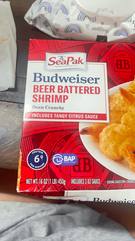 Shrimp, budweiser® lager beer (water, barley malt, rice, hops), soybean oil, cornstarch, enriched wheat flour (wheat flour, niacin, iron as ferrous sulfate, thiamine mononitrate, riboflavin, folic acid), wheat flour, yellow corn flour, contains less than 2% of the following: sugar, beer extract, yeast extract, salt, rice starch, natural flavor, tapioca starch, modified cornstarch, leavening (sodium acid pyrophosphate, baking soda, sodium aluminum phosphate), guar gum, xanthan gum, yeast, dextrose, sodium tripolyphosphate (to retain moisture), sodium bisulfite (as a preservative). sauce: sugar, water, orange peel, prepared mustard (mustard seed, turmeric, paprika, garlic powder), horseradish (horseradish, water, organic vinegar, salt, natural flavor), orange juice concentrate, pepper sauce (peppers, vinegar, salt), citric acid, xanthan gum, spices, natural flavor, salt, lemon juice concentrate, paprika oleoresin.