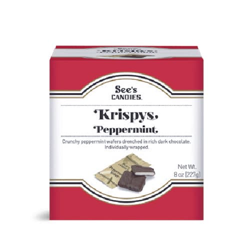 Dark chocolate [sugar, chocolate, cocoa butter, butter (milk), soy lecithin (an emulsifier), vanilla, vanillin (an artificial flavor)], sugar, corn syrup, water, butter, peppermint oil, salt, baking soda, cornstarch, pecans, almonds, peanuts.