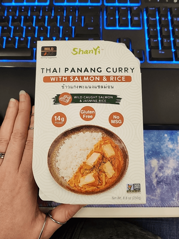 Panang curry with salmon: coconut milk, pink salmon, bamboo shoot, water, panang curry paste (garlic, chili, lemongrass, refined salt, galangal, kaffir lime peel, shallot, mung bean), rice bran oil, sugar, red spur pepper, modified tapioca starch, salt, kaffir lime leaf, cumin powder. jasmine rice: jasmine rice and rice bran oil