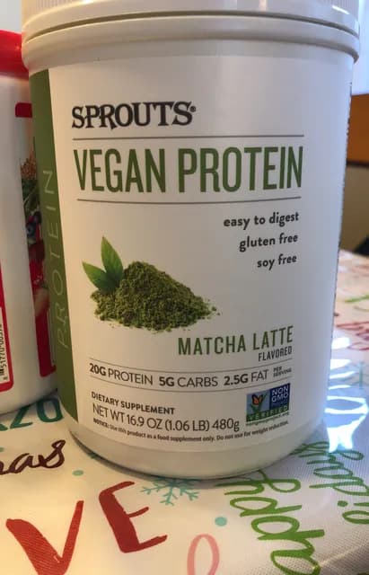 Pea protein isolate, organic brown rice protein concentrate, natural matcha latte flavor, flax seed powder, matcha green tea leaf powder, chia seed powder, stevia leaf extract, sprouted black rice powder, sea salt, potassium chloride, veggie & fruit powder blend (grape seed & skin extract, blueberry extract, raspberry extract, cranberry extract, prune powder, cherry powder, bilberry extract, strawberry powder, broccoli cruciferous extract, spinach powder, tomato powder, carrot powder, onion powder), monk fruit extract, alpha-galactosidase, and prodigest enzyme blend.
