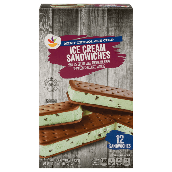 Ice cream (milkfat and nonfat milk, chocolate chips [sugar, unsweetened chocolate, dextrose, cocoa butter, soy lecithin], sugar, buttermilk, corn syrup, whey, contains 2% or less of peppermint oil, cellulose gum, cellulose gel, tara gum, guar gum, carrageenan, carob bean gum, xanthan gum, mono- and diglycerides, yellow 5, blue 1), wafers (wheat flour, sugar, caramel color, dextrose, palm oil, corn flour, contains 2% or less of corn syrup, cocoa processed with alkali, food starch-modified, salt, soy lecithin, mono- and diglycerides, baking soda).