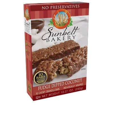 Granola (whole grain rolled oats, sugar, corn syrup, palm kernel and soybean oils, honey, coconut, soybean oil, molasses, soy lecithin, salt, almond meal, peanut flour, dried egg whites), corn syrup, macaroon coconut, sugar, palm and palm kernel oil, palm kernel and soybean oils, water, crisp rice (rice flour, sugar, whey, salt, barley malt, wheat flour, dextrose), nonfat dry milk, sorbitol, cocoa, corn starch, soy lecithin, salt, carrageenan, mono- and diglycerides, vanillin.