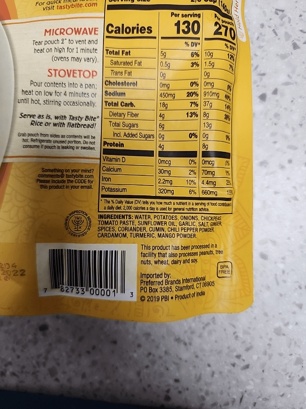 Water, potatoes, onions, chickpeas, tomato paste, sunflower oil, garlic, salt, ginger, spices, coriander, cumin, chili pepper powder, cardamom, turmeric, mango powder.