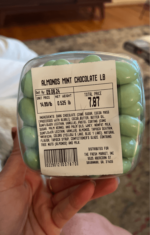 Dark chocolate (cane sugar, cocoa mass [processed with alkali], cocoa butter, butter oil, sunflower lecithin, vanilla), pastel coating (cane sugar, palm kernel and palm oils, whey, nonfat milk, sunflower lecithin, vanilla), almonds, tapioca dextrin, artificial colors (yellow 5 lake, blue 1 lake), natural flavor, tapioca syrup, confectioner's glaze.