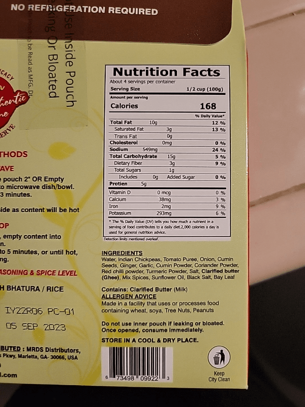 Water, indian chickpeas, tomato puree, onion, cumin seeds, ginger, garlic, cumin powder, coriander powder, red chilli powder, turmeric powder, salt, clarified butter (ghee), mix spices, sunflower oil, black salt, bay leaf
